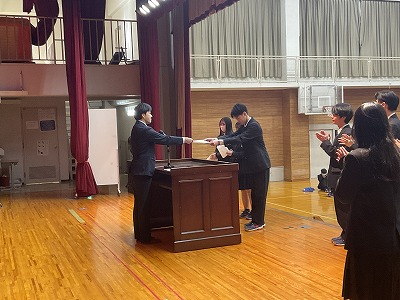 式の後には表彰伝達が行われ、今学期、漢字検定や英語技能検定、色彩検定等、さまざまな分野で活躍した生徒たちの努力が称えられました。