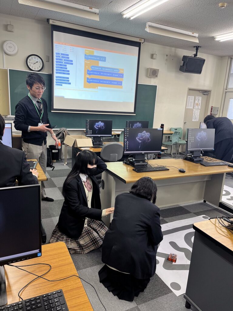 生徒たちはモーターが搭載されたロボットをプログラムの内容を変えることによって、スピードや動き方を調節し、レーンをより早く正確に走るように探究しました。