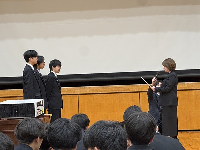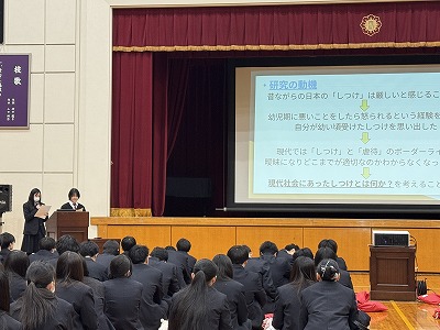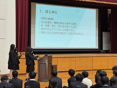 「子どもの自己肯定感を高める保育の方法」、「消費カロリーの高いカラオケ楽曲の特徴」、「AI医療への抵抗感や期待度に男女差があるのか」など独自性あふれるテーマで、聴いている生徒は驚いたり頷いたりしていました。
